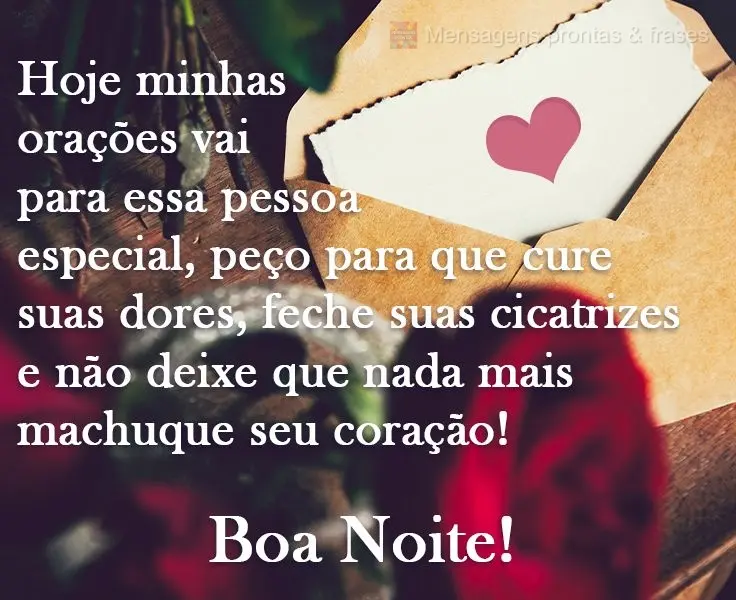 Hoje minhas orações vão para essa pessoa especial, peço para que cure suas dores, feche suas cicatrizes e não deixe que nada mais machuque seu coração! Boa Noite!