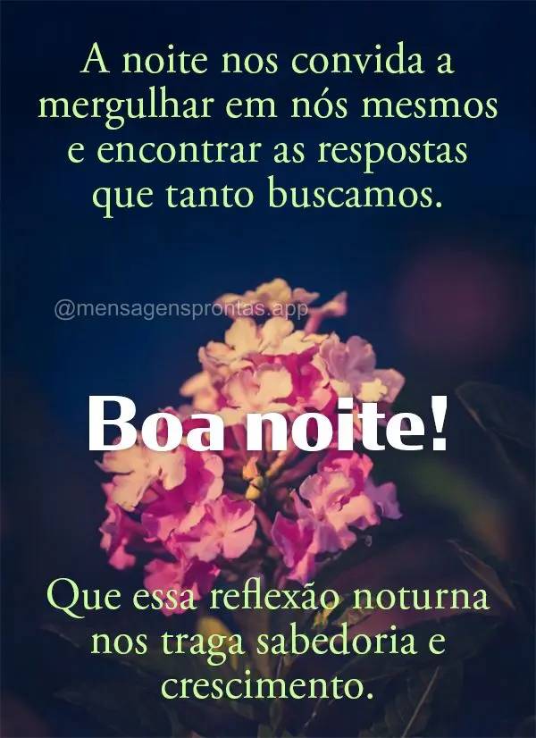 Que seja uma noite tranquila onde possamos enxergar nosso esforço e dedicação ao longo do dia, e sentir gratidão por mais um dia vivido! Boa noite!