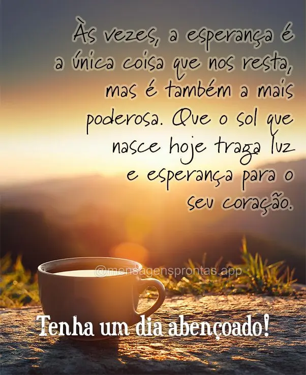 Às vezes, a esperança é a única coisa que nos resta, mas é também a mais poderosa. Que o sol que nasce hoje traga luz e esperança para o seu coração. Tenha um dia abençoado!