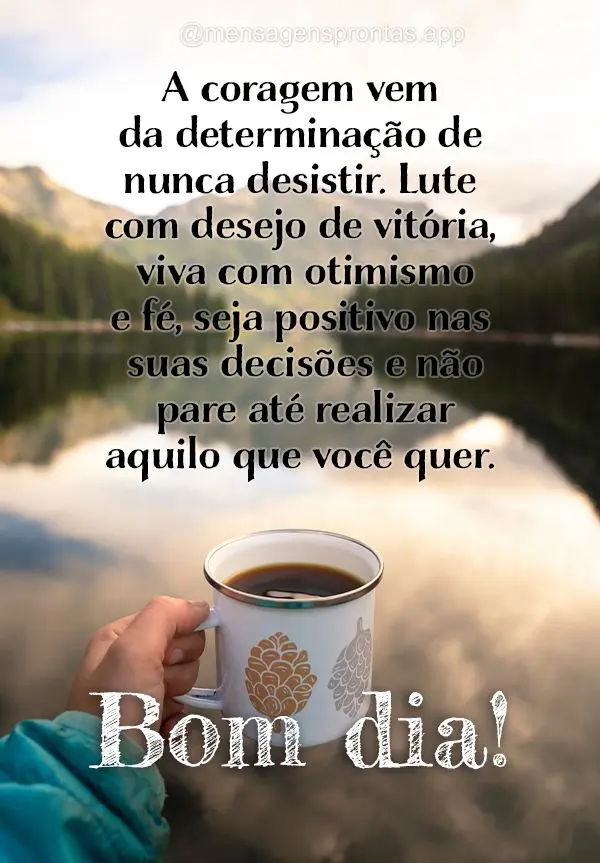A coragem vem da determinação de nunca desistir. Lute com desejo de vitória, viva com otimismo e fé, seja positivo nas suas decisões e não pare até realizar aquilo que você quer. Bom dia!