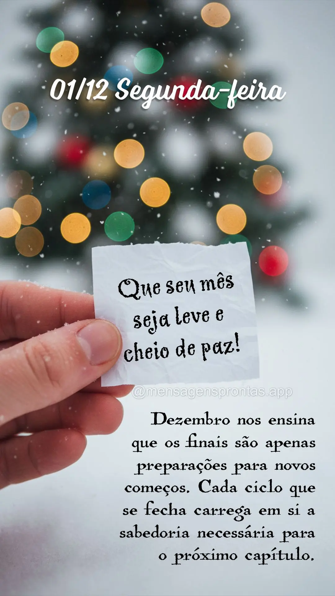 Dezembro nos ensina que os finais são apenas preparações para novos começos. Cada ciclo que se fecha carrega em si a sabedoria necessária para o próximo capítulo. Que seu mês seja leve e cheio de paz! 01/12 Segunda-feira